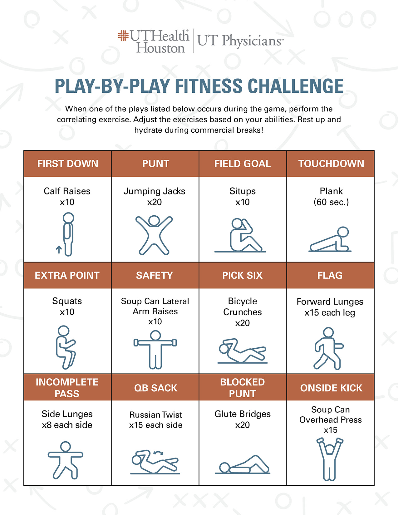 Wow your football watch party with this UT Physicians fitness game expertly crafted for simple, easy-to-follow fun that can be adjusted for individual fitness levels.