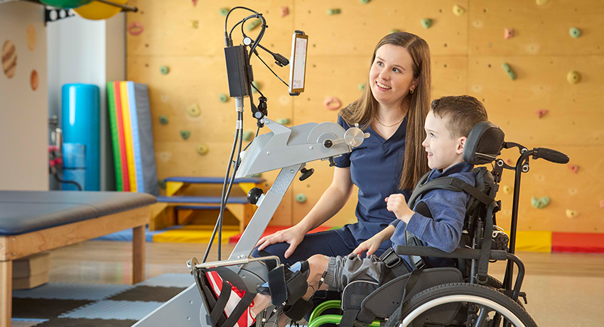 The therapy space features evidence-based equipment focused on strength, functional mobility, and postural control, including upper- and lower-extremity Functional Electrical Stimulation bikes, rock wall, and body-weight supported treadmill training. Each tool is created to help children as they build skills needed for everyday life. Patients can also take advantage of feeding intensives as well as constraint induced movement therapy.