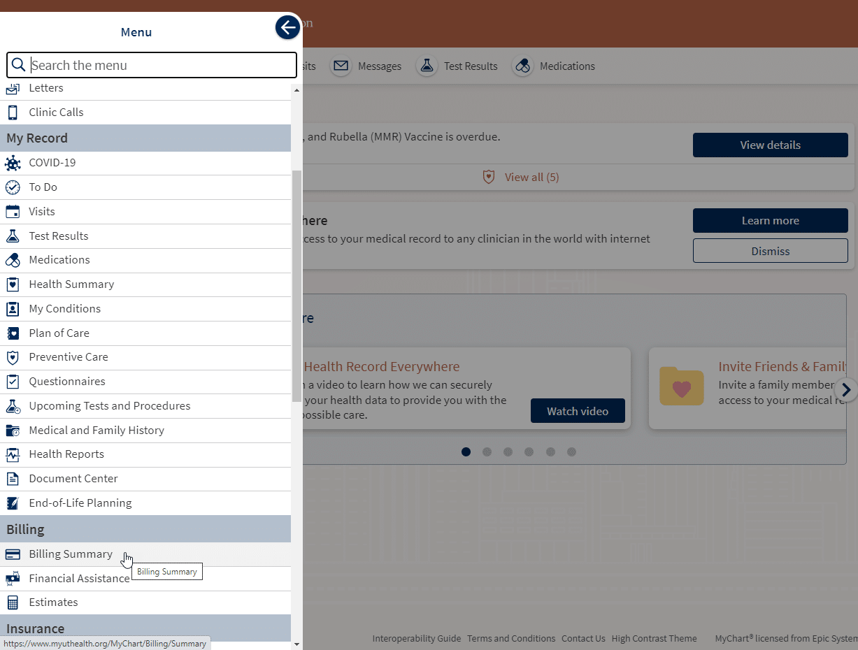 You can view your billing statements by logging in to MyUTHealth Houston or through the mobile app. You can view your invoices by selecting Billing Summary in the main menu. Those without a MyUTHealth Houston portal account can view their billing statements by selecting View balance details in the email or text message they receive.