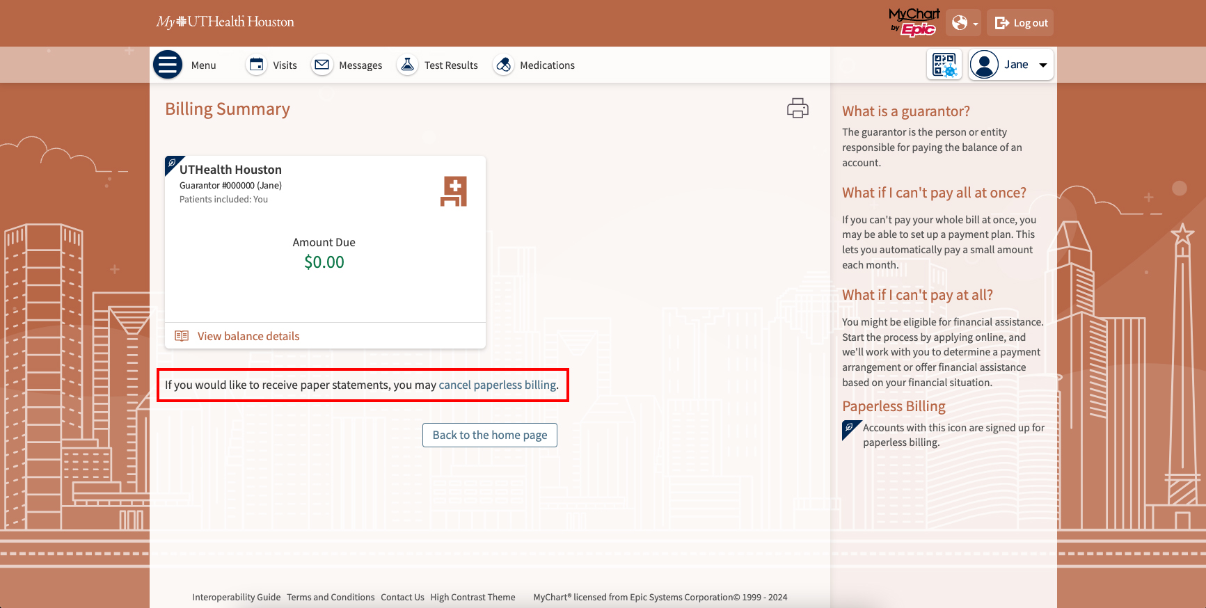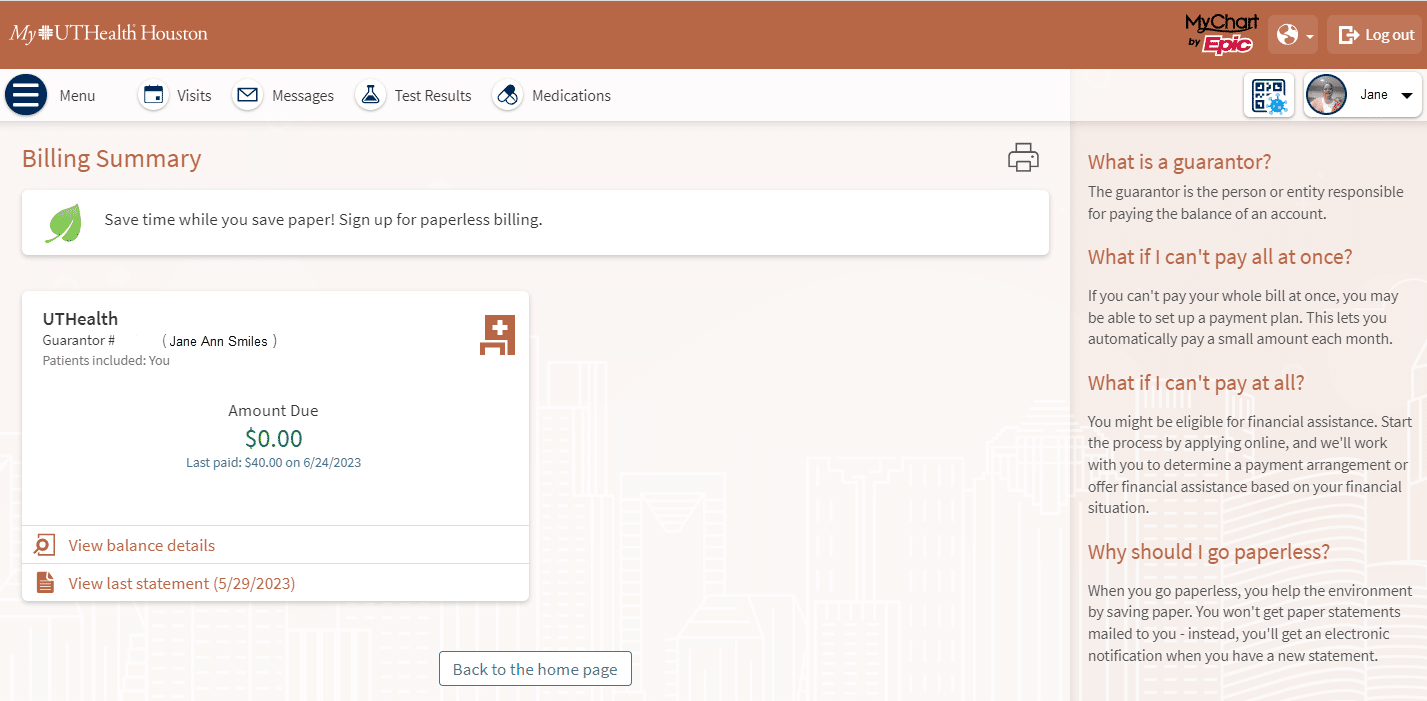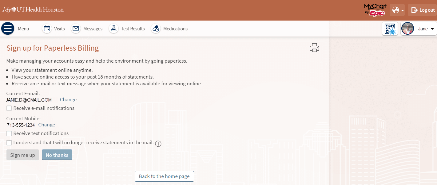 If you have a MyUTHealth Houston patient portal account, you can opt out of paperless billing by selecting Billing Summary in the main menu. Then select the option to update your preferences. For those who don’t have a MyUTHealth Houston patient portal account, you can update your preferences by accessing the link provided in your email or text messages, by speaking with a member of your health care team at your next visit, or by calling 855-877-2808.