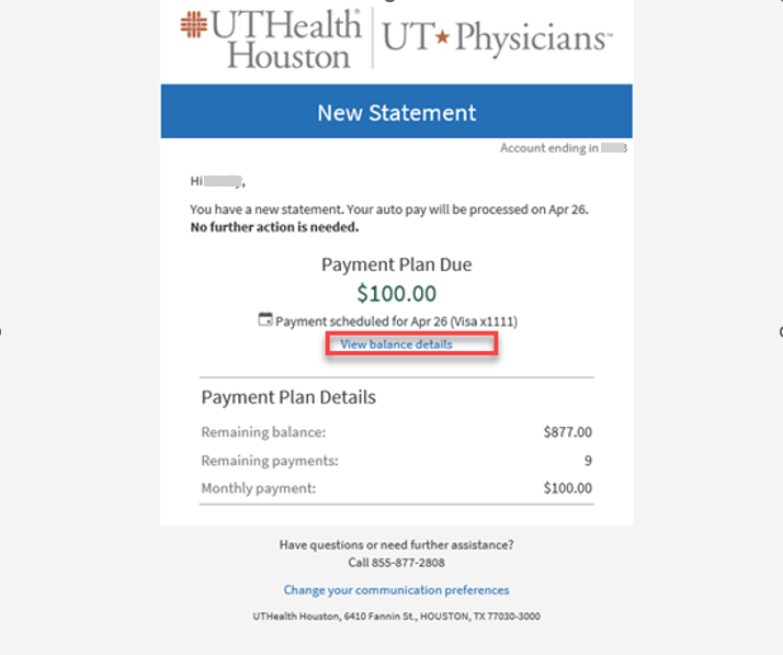 To reduce health care costs, enhance payment convenience for patients,, and be environmentally friendly, UTHealth Houston and UT Physicians transitioned to paperless billing on October 21, 2024. Patients (or their guarantors) now receive electronic notifications at the email address and/or mobile phone number on record.
