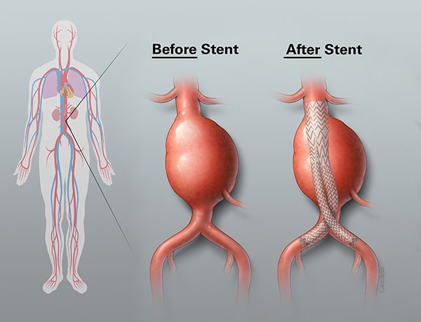She says the stent graft, or synthetic tube, is hollow and the blood flows through it, relieving pressure against the aneurysm.