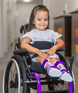 The UT Physicians team outfitted Zanelle with a series of leg braces to continue improving muscle strength and alignment. She wears an ankle-foot orthosis (AFO) brace during the day to support and straighten her feet into the correct position. Zanelle also wears a knee-ankle-foot orthosis (KAFO) at night to maintain the stretching on her knees. A third brace called a hip-knee-ankle-foot orthosis (HKAFO) attaches at her waist. She wears the HKAFO during therapy and when practicing standing.