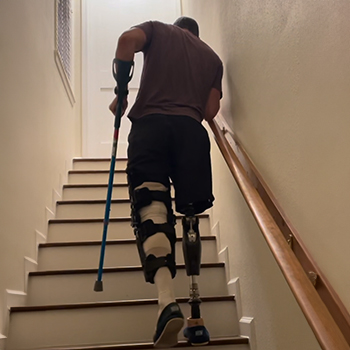 At the time, Mark lived in a second-floor duplex with no elevator. Imagine navigating stairs to your front door with a crutch and a prosthetic leg as your good leg for six weeks. His work-around included a tricep pushup: leaning on the arm rail and pushing up with one hand on a crutch and standing on his prosthesis. Mark described it as a humbling experience.