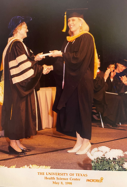 She graduated from Cizik School of Nursing at UTHealth Houston in 1992 with her bachelor’s degree and in 1998 with her master’s degree.
