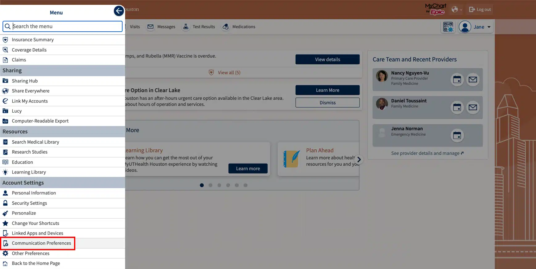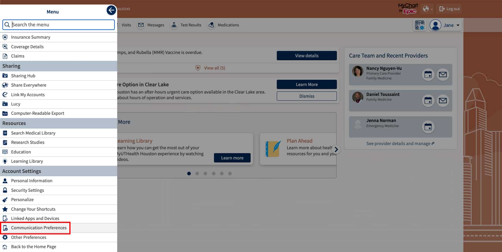 - In your MyUTHealth Houston patient portal, from the Menu navigate to Account Settings > Communication Preferences.