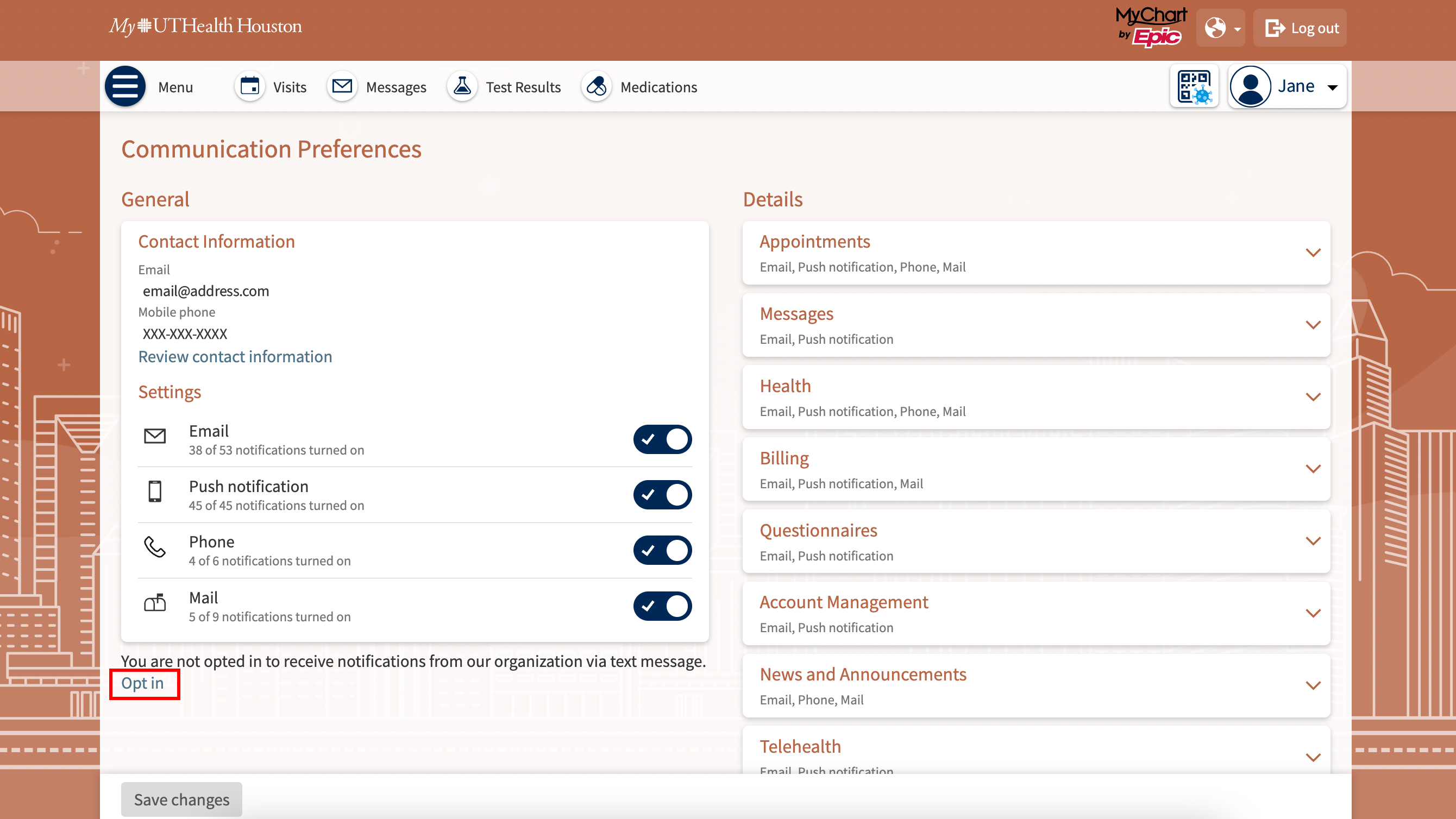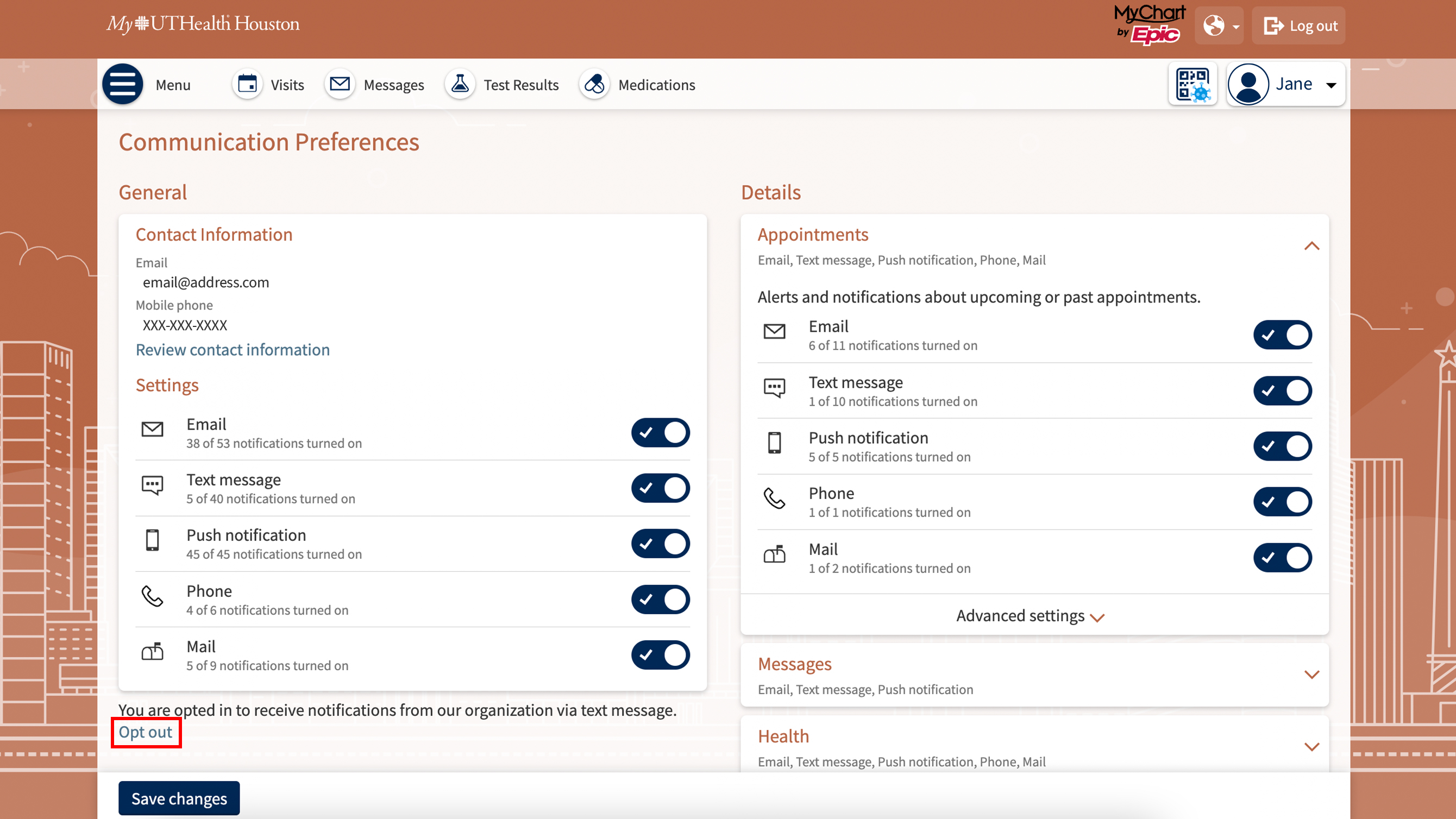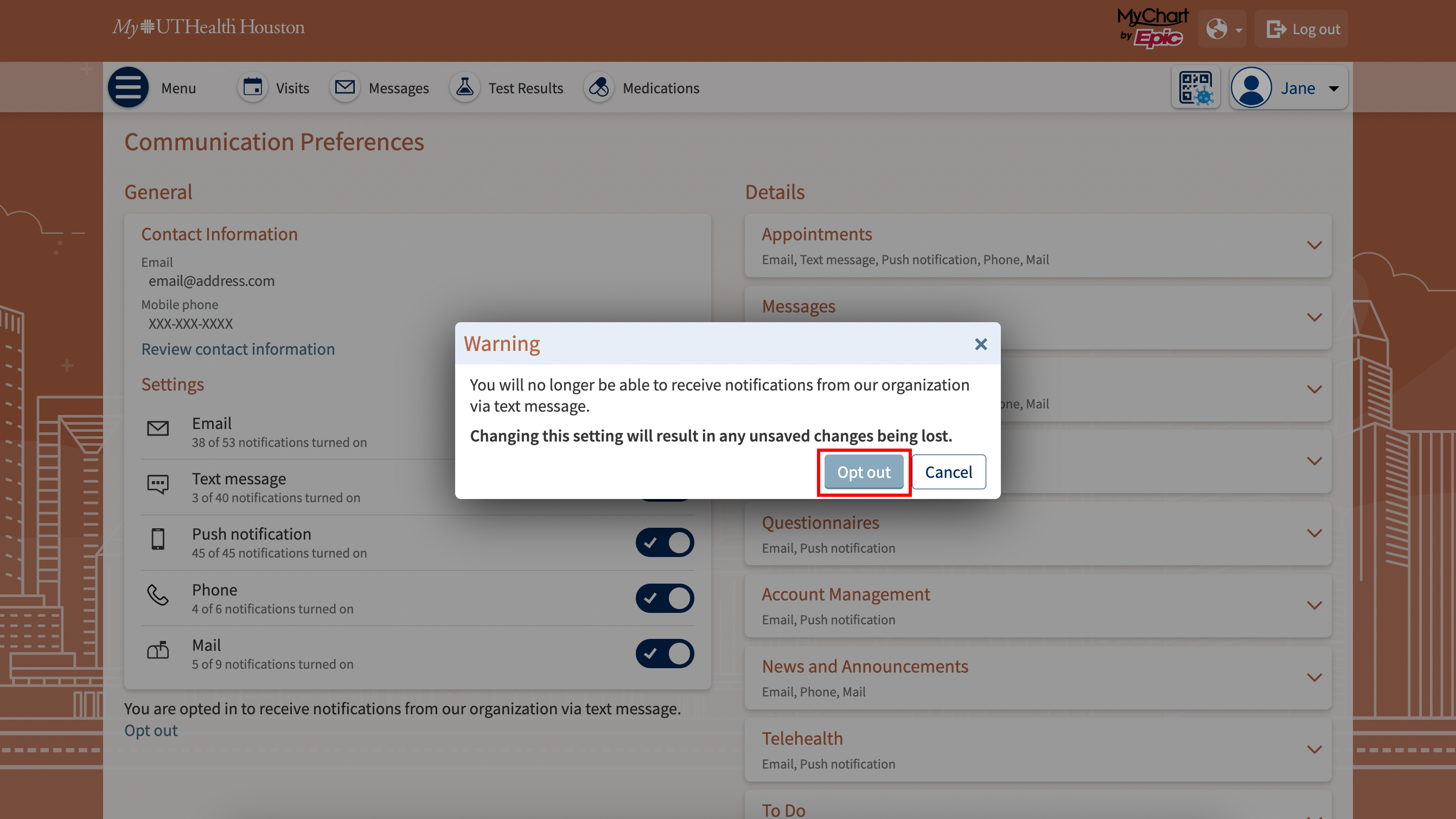 You can speak with a member of our health care team at your next office visit to assist updating your communications preferences.How to opt out in MyUTHealth Houston text messaging
