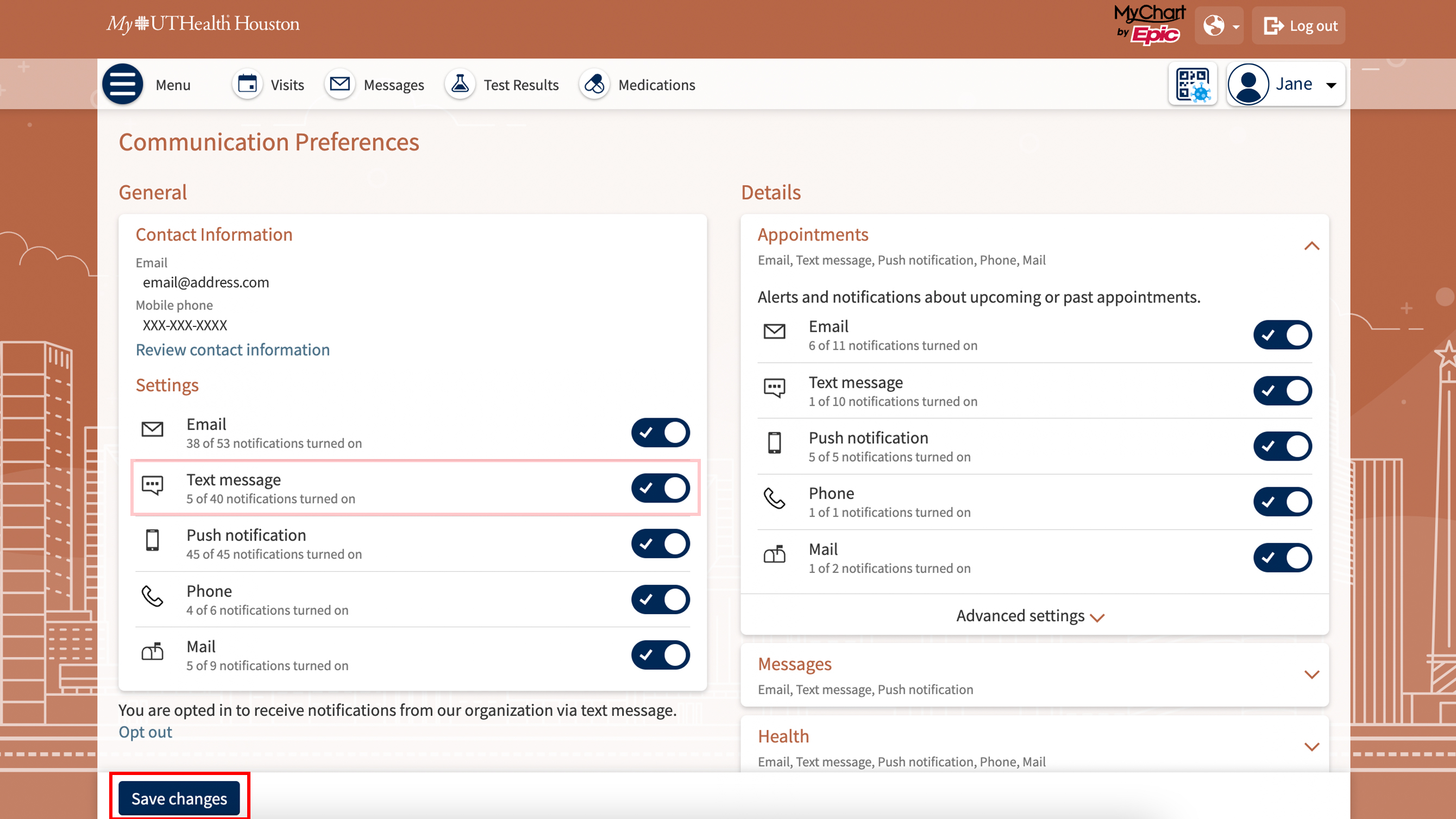 In your MyUTHealth Houston patient portal, from the Menu navigate to Account Settings > Communication Preferences.- In the General section, verify notifications are toggled on for your preferred method(s) of contact (email, text, phone, or mail).
